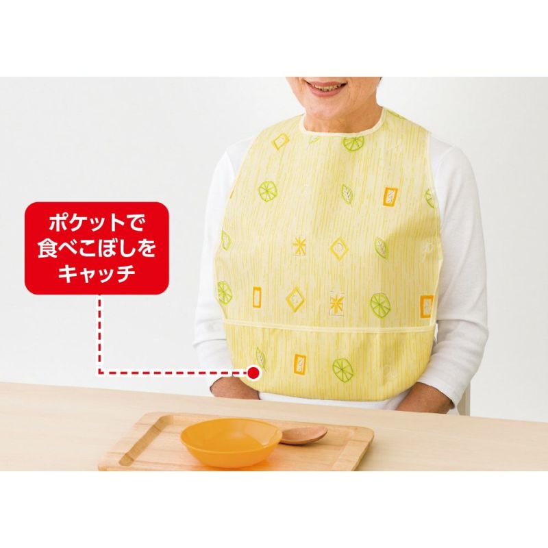 スソを折り返すだけでポケットになり、食べこぼしも安心。