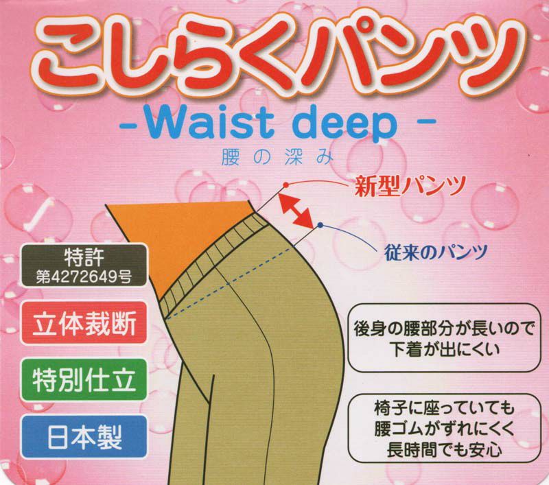 まずはじめに特許品腰曲がりズボンを履いてみて頂いて、もっとスマートにはきたい場合にCラインパンツをお試しになってくださいませ。