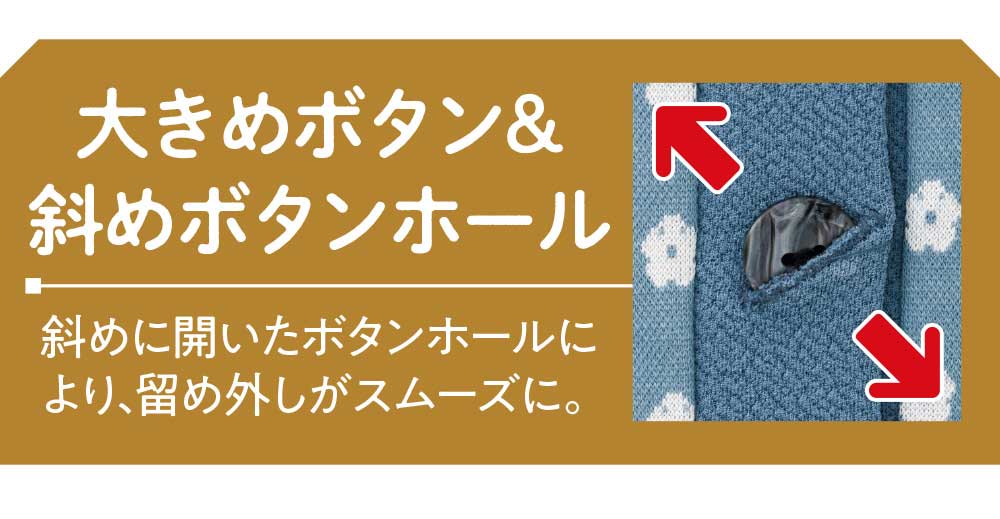 ●大きめボタンと斜めボタンホールで留め外ししやすい設計