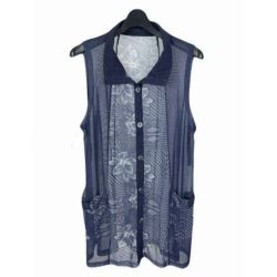 婦人襟付きプリント透かし花柄ベストポケット付き薄紺系