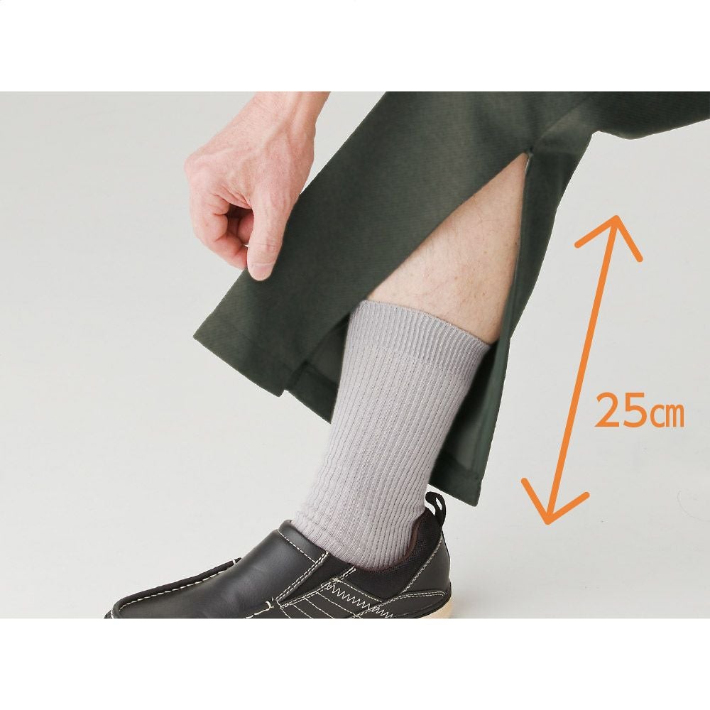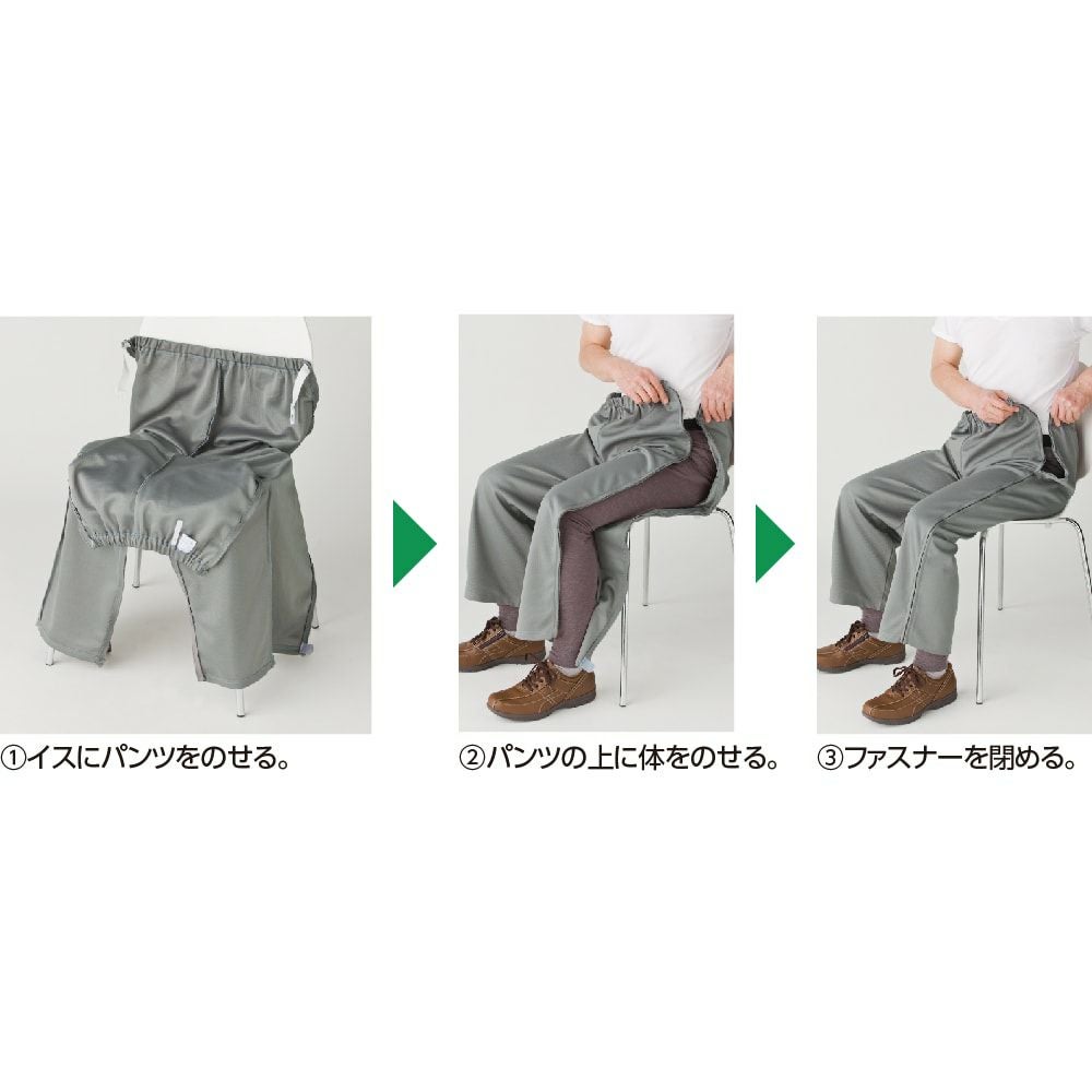 ファスナーをすれば普通のズボンと変わりなく履くことができます。足湯につかる時やお庭の水やりなどにも便利です。