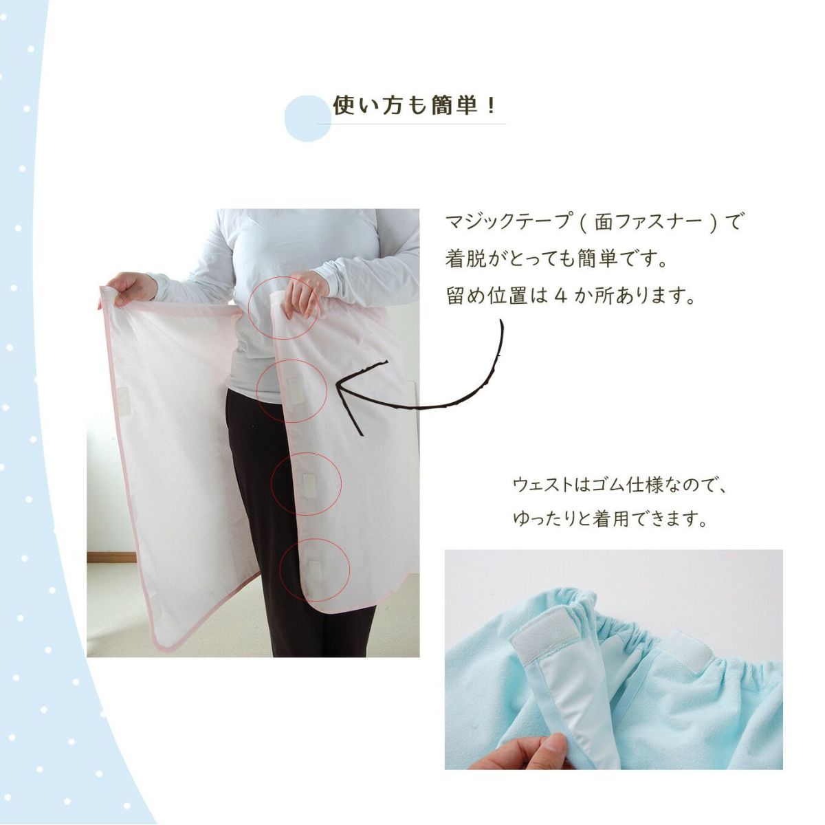 前合わせのワンタッチテープ式で着脱がスムーズ。