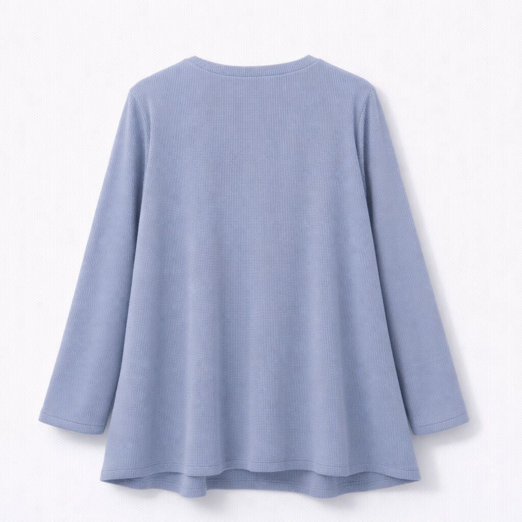 冷房の効いた夏の室内などでアウターとしておしゃれを楽しむシニアの長袖Tシャツです。
