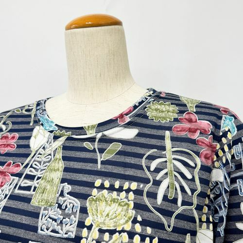 5. 婦人ミセスレディース綿混シャドーボーダーTシャツイラストタッチ柄M~L