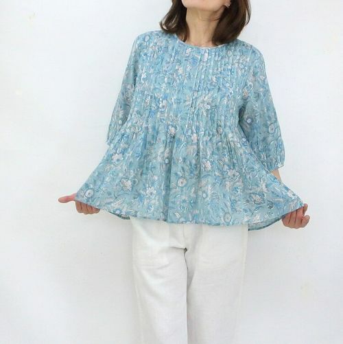 婦人インド綿ピンタック七分袖プルオーバーブラウス(ブロックプリント)
