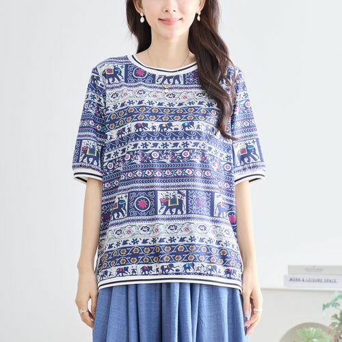 ラインリブエスニック柄象プリントトップス