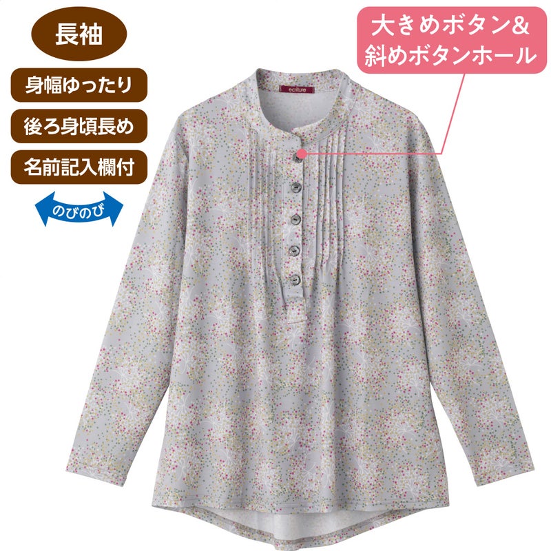 定番のピンタックブラウスも、斜めボタンホールで着脱スムーズに。