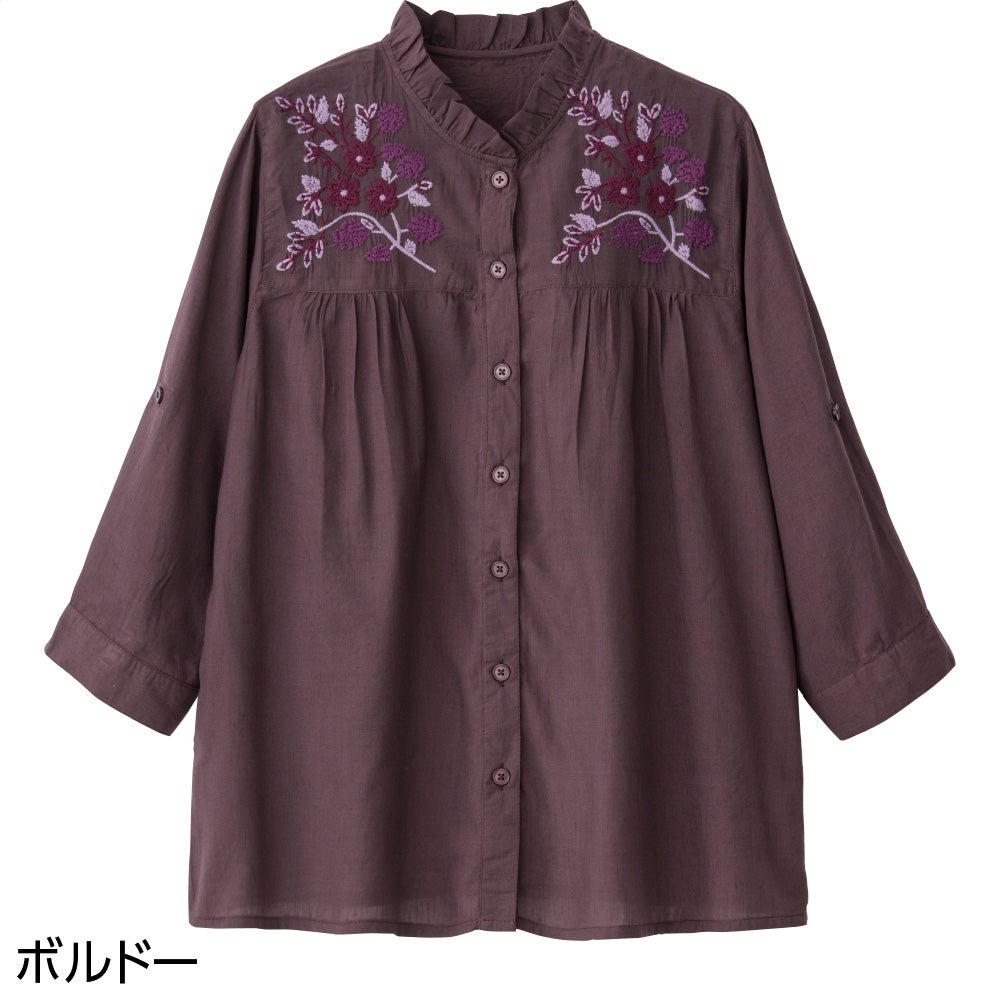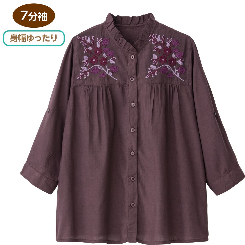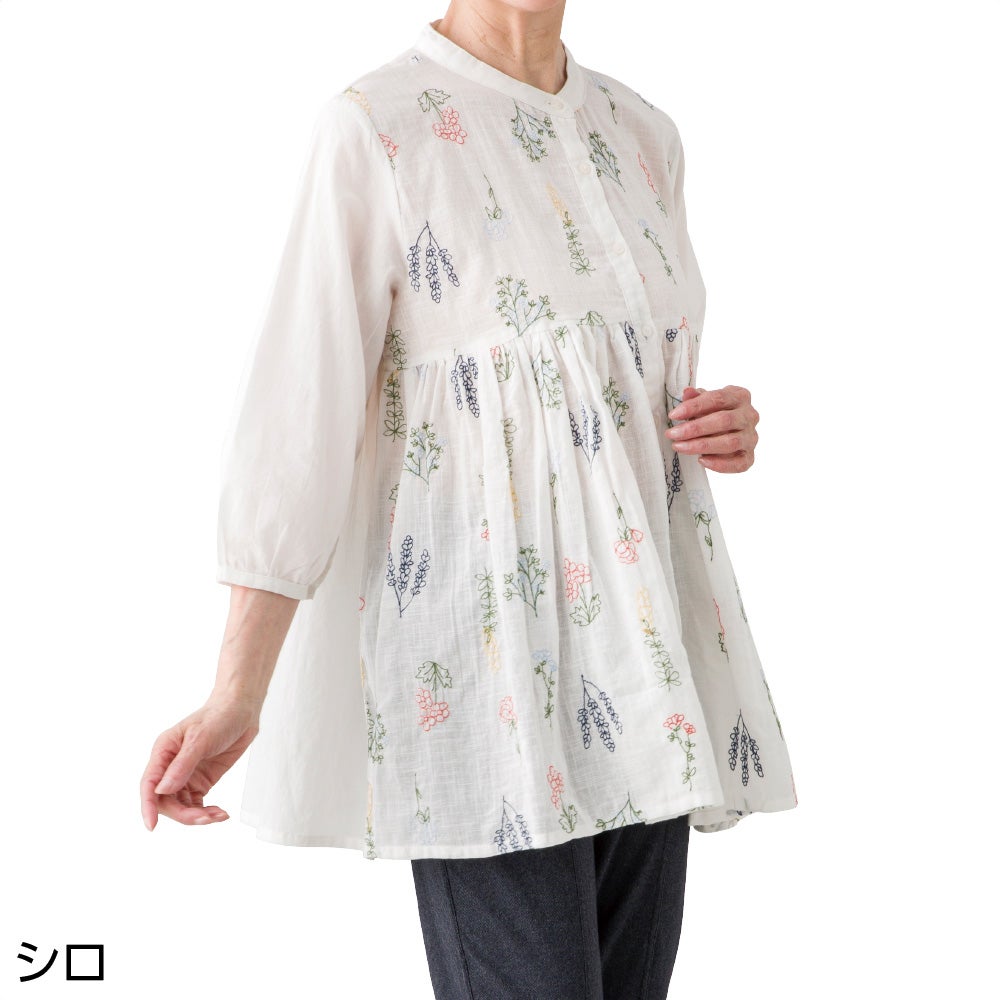 他の画像を見る 7分袖花柄刺繍前開きブラウス(婦人) LLサイズあり 綿100% 予約商品 こちらは予約商品です 予約販売価格 ¥ 4,378 税込 予約受付期間 2026/03/28 0:00 〜 2026/04/21 0:00 風を通す程よいふわっとシルエット。 サイズ M、L、LL カートに入れる お気に入りに登録する