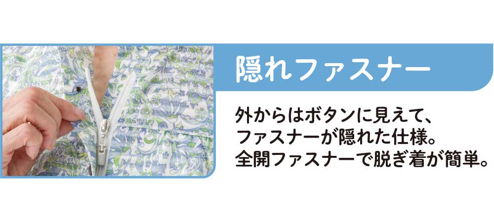 ●外からはボタンに見える、隠しファスナーで全開できます。