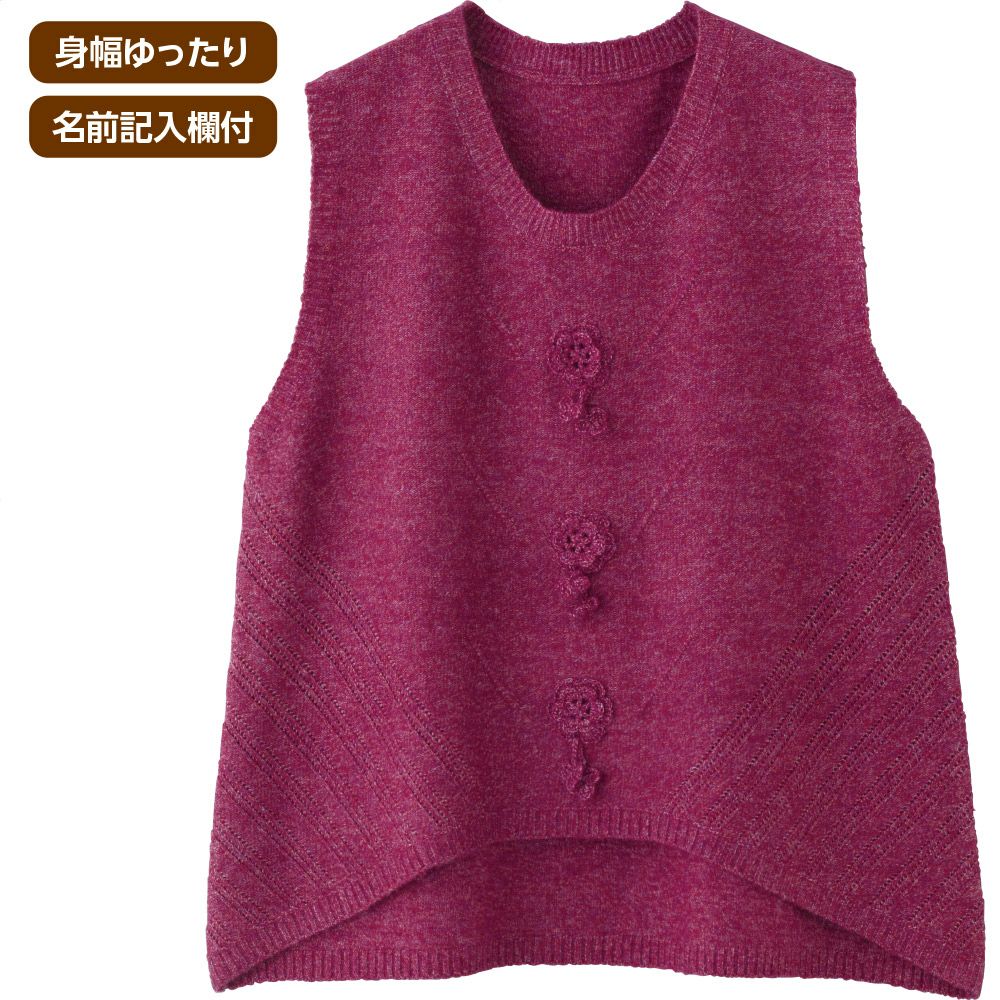 ボタンホールが斜めで、ボタンを留めるのが困難な方でも着脱しやすく、介護する方も着せやすいおしゃれな斜め釦ホール・ベストです。