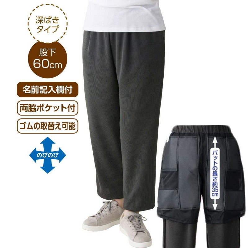 低反発素材(衝撃を吸収する不織布を重ねた2mmのパッド)をパンツの裏側に縫いつけることで、腰やお尻だけでなく横からの摩擦・圧迫も軽減。