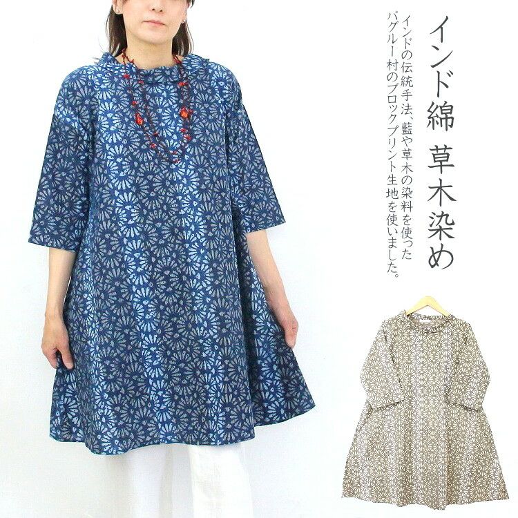 婦人ロールカラーインド綿Aラインチュニック草木染めコットン100%花柄ブロックプリント