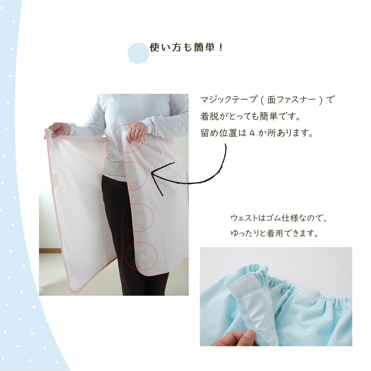 簡単に着脱できるワンタッチテープ。
