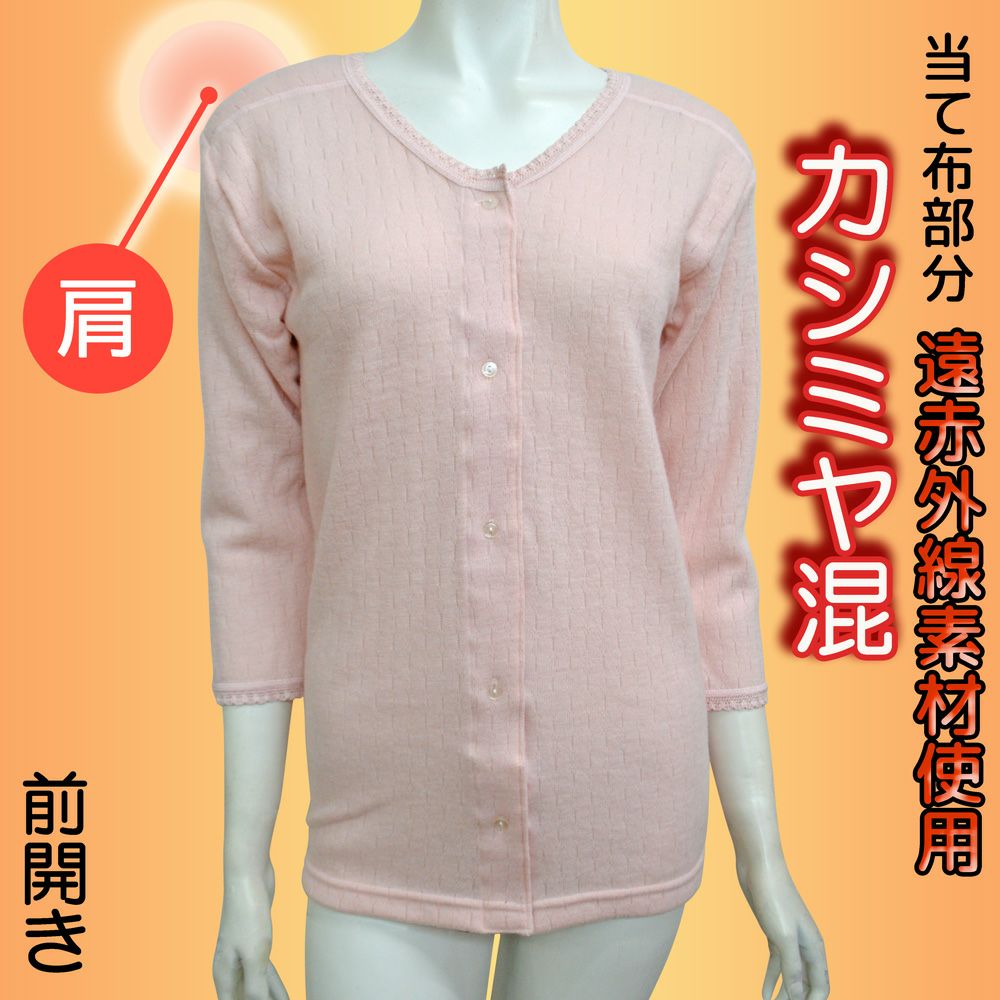 婦人カシミヤ混前開き八分袖インナー(当て布部分遠赤加工)