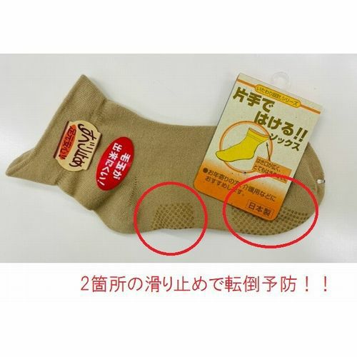 他の画像を見る はき口が広く、とてもはきやすい! 婦人パイル片手ではけるソックスすべり止め付き(色お任せ受注いずれか一足) ¥ 1,280 税込 片手でも楽にはけるので、お年寄りの方、介護用などにおすすめです。日本製の滑り止め付き靴下です。サイズ 22~24cm カートに入れる お気に入りに登録する