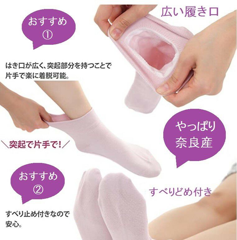 他の画像を見る はき口が広く、とてもはきやすい! 婦人片手ではけるソックス一足組(すべり止めなし)22~24cm(色お任せ受注いずれか一足) ¥ 748 税込 片手でも楽にはけるので、お年寄りの方、介護用などにおすすめです!肌に触れる部分は綿100%のやさしい素材。 日本製の便利な靴下です! サイズ 22~24cm カートに入れる お気に入りに登録する