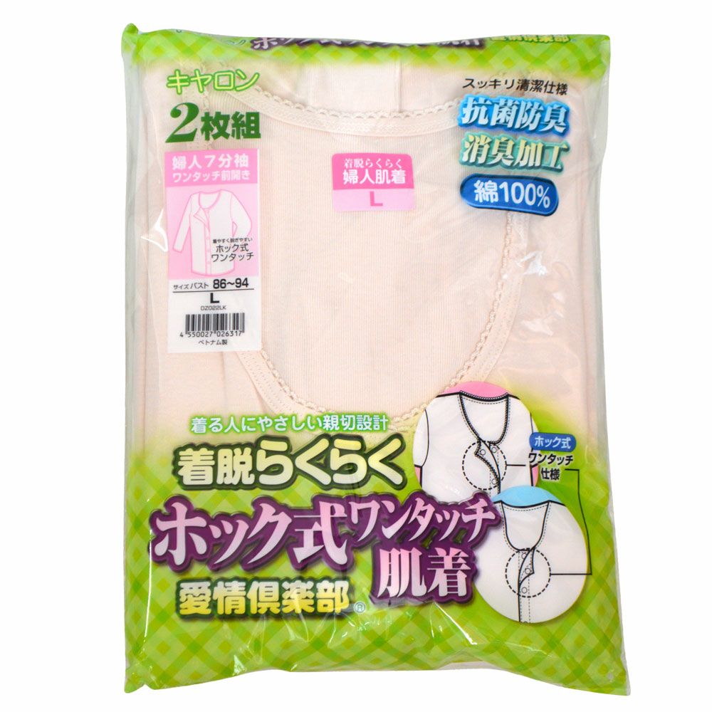 他の画像を見る 抗菌防臭・消臭加工 婦人キャロン着脱らくらくホック式ワンタッチ前開き7分袖肌着(2枚組)サイズ M、L、LL 綿100% 大きいサイズあり ¥ 3,000 税込 抗菌防臭、消臭加工、綿100%のスッキリ清潔仕様 サイズ M、L、LL カートに入れる お気に入りに登録する