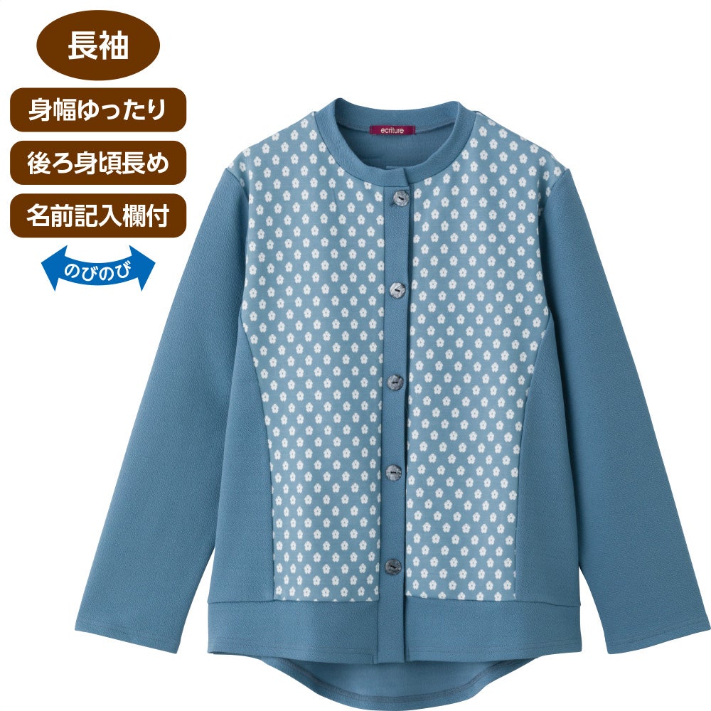 見た目は普通のボタン留めですが、飾りボタンで実際はワンタッチテープ留めの前開きの服ブラウスなのでおしゃれでリハビリや介護にも好適です。