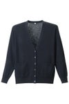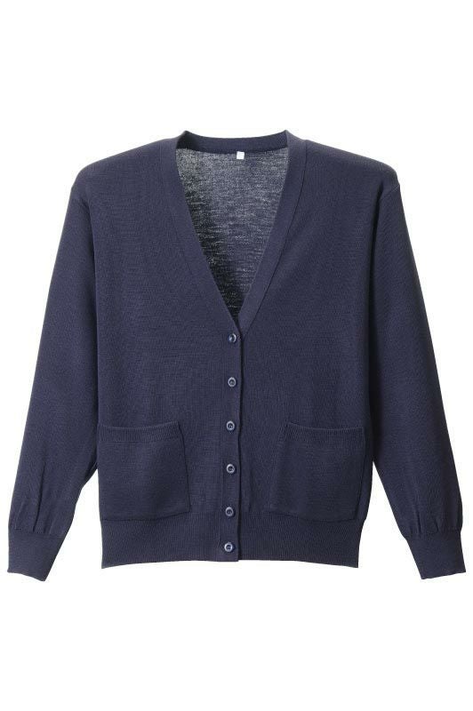 国産の毛玉ができにくい無地の定番カーディガンですから、おそろいの制服やお仕事着に、お出かけ着にも広く活躍するカーディガンです。