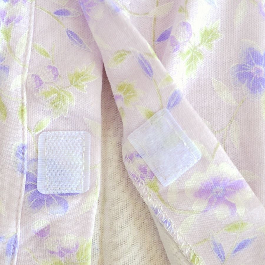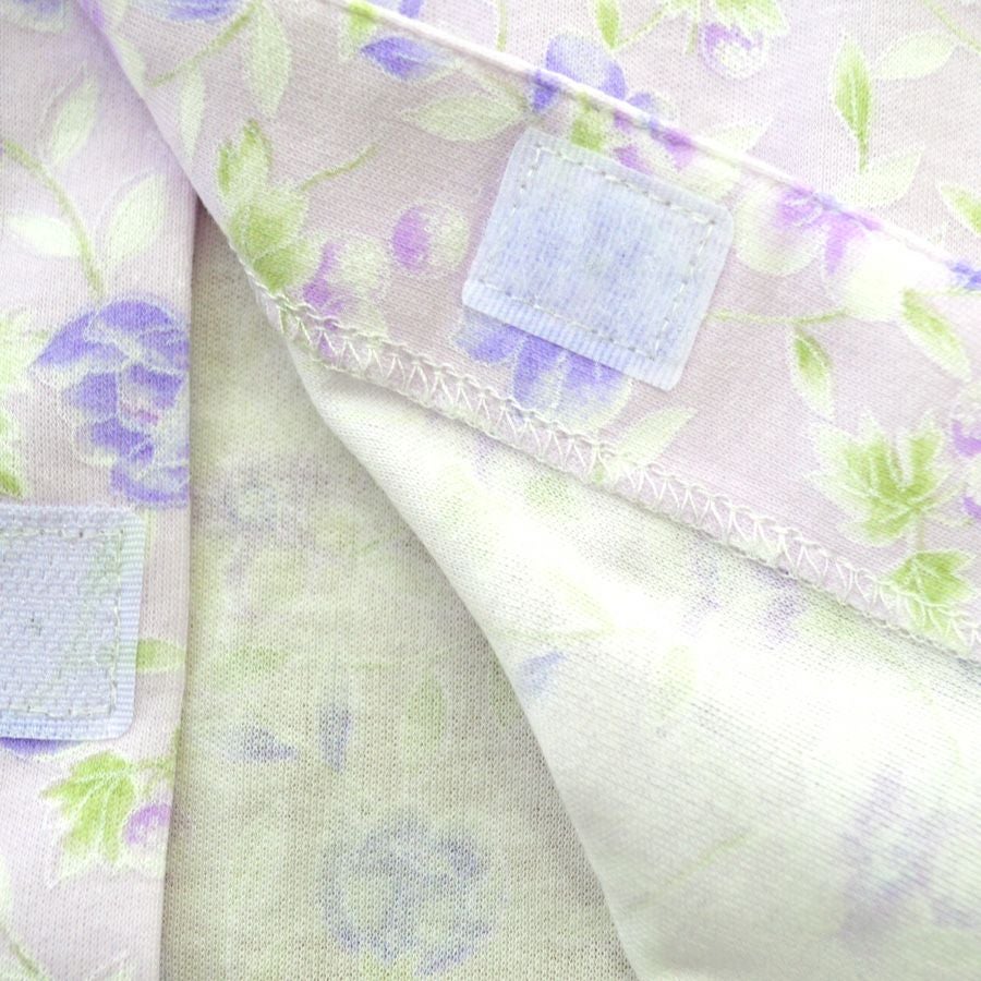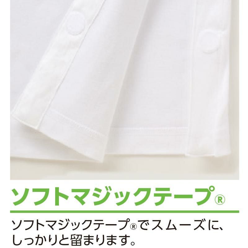 上着前開き部分、袖口、ズボン腹部、ズボン裾口にワンタッチテープを使い、開口部加工が施されていますのでオムツ交換やお着替えがスムーズです。