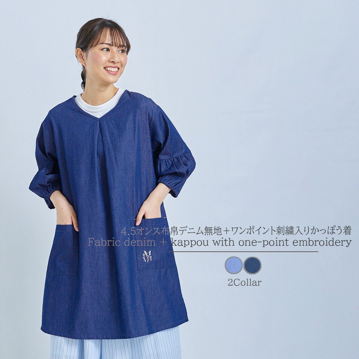 レディースデニムポケットワンポイント刺繡入りかっぽう着ブルーM~Lフリー