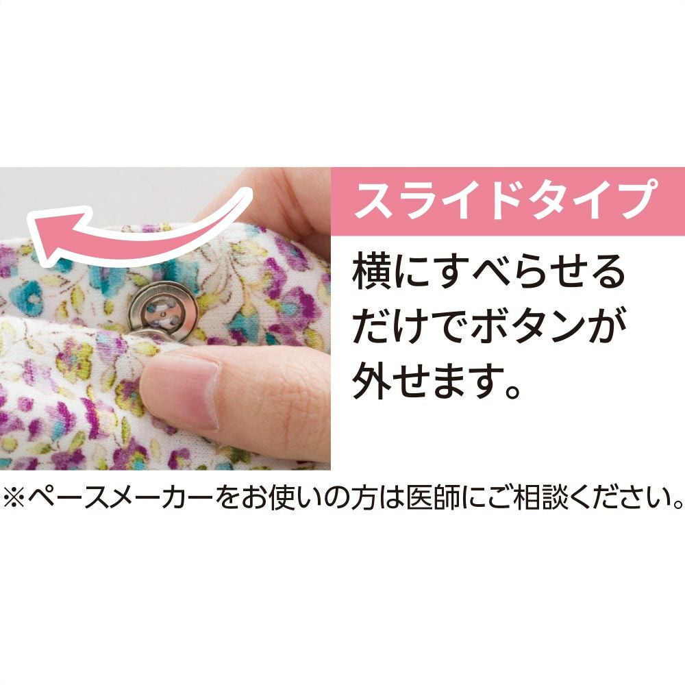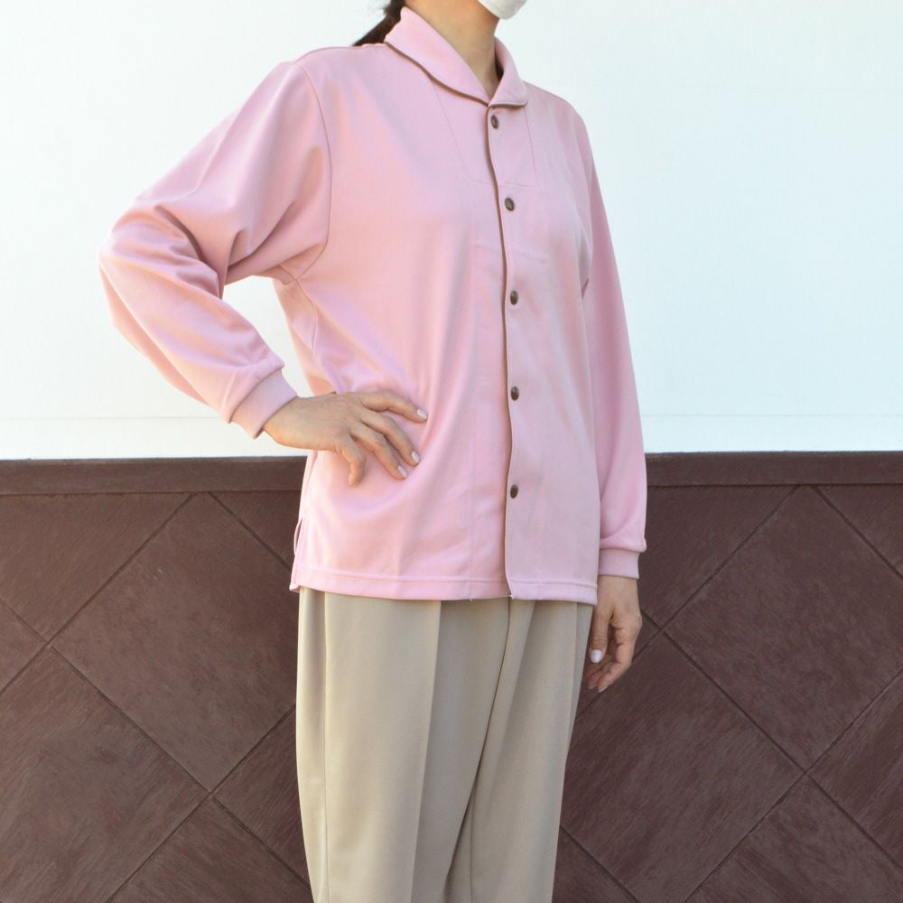 見た目は普通のボタン留めですが、飾りボタンで実際はワンタッチテープ留めの前開きの服ブラウスなのでおしゃれでリハビリや介護にも好適です。