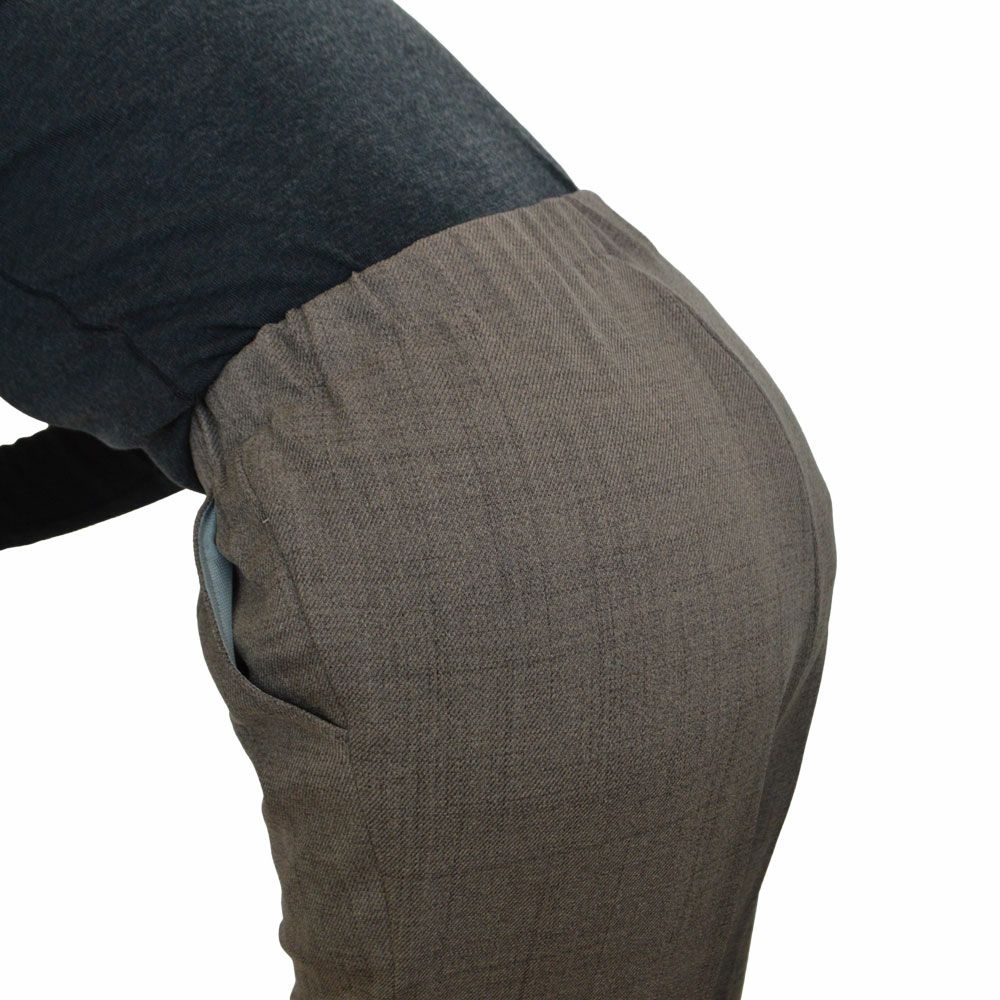 こちらのおズボンは腰が曲がった人のために作られた、後ろを長く立体裁断をした、特別仕立ての特許取得のおズボンになります。