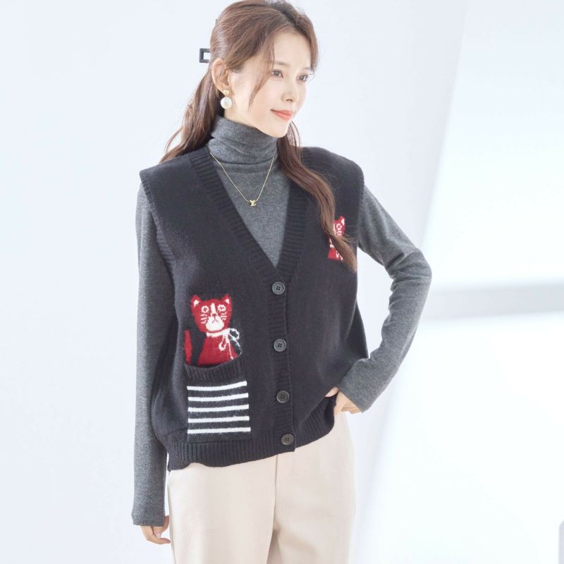 【M〜L】レデイース可愛いイラストポケット猫柄ニットベスト