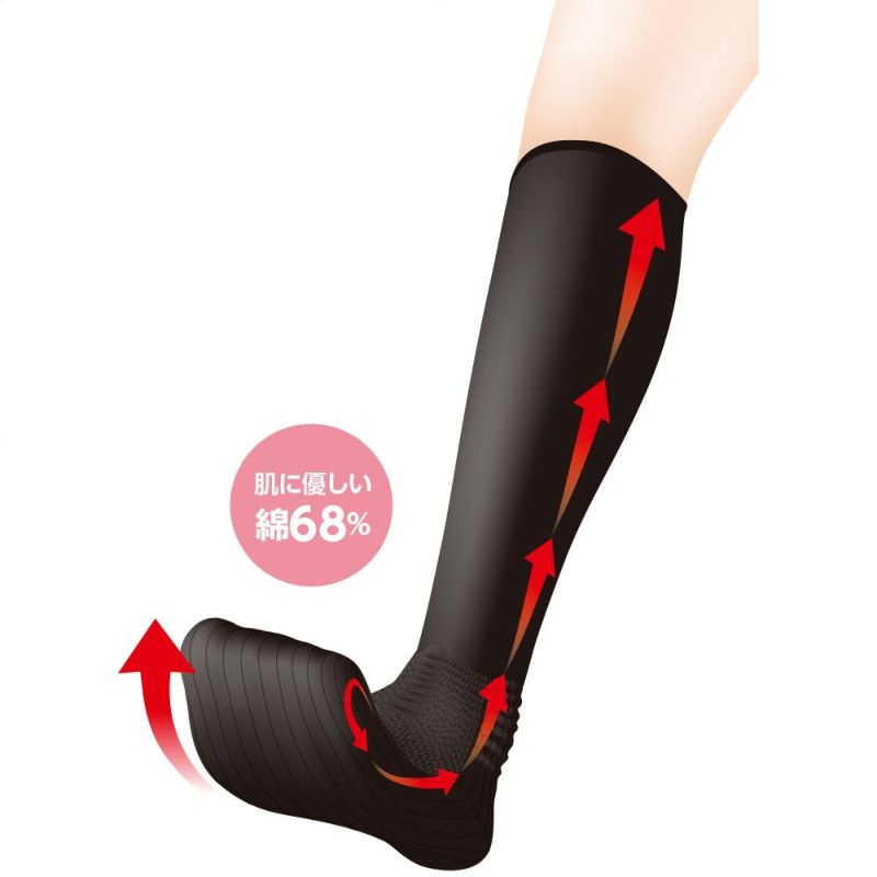 異なる編み方を組み合わせることで、つま先の引き上げ効果をもたらし、ふくらはぎの筋肉が収縮します。ソフトな加圧で効果を発揮。