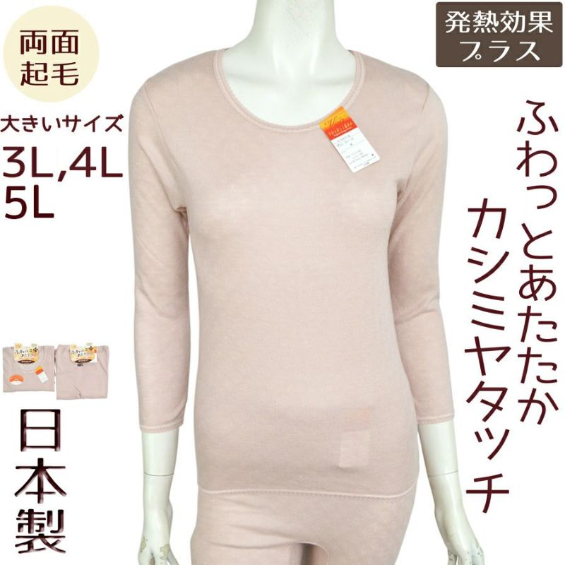 5. 婦人カシミヤタッチ両面起毛発熱効果ふわっとあたたか8分袖インナー(後ろ身頃長め)大きいサイズ 3L4L5L日本製